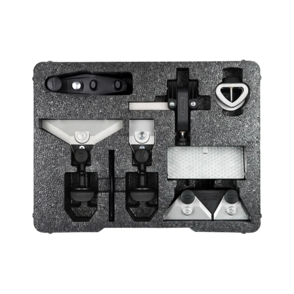 This kit contains all the jigs you need to sharpen all types of knives, scissors, lawnmower blades, axes as well as short chisels and carving tools. The perfect package to sharpen all your edge tools at home or in the workshop. And to store your jigs neatly and tidily of course!