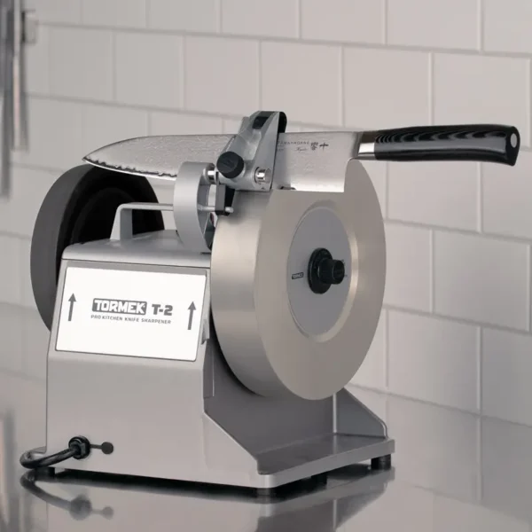 With more than 40 years of experience of professional sharpening for woodworkers and trades, Tormek developed a sharpening machine specifically designed for sharpening chef’s knives – on site in the restaurant kitchen. The Tormek T-2 Pro Kitchen Knife Sharpener meets the professional kitchen’s stringent demands for sharpness, simplicity, and speed. Your knives are sharp, just when you need them!